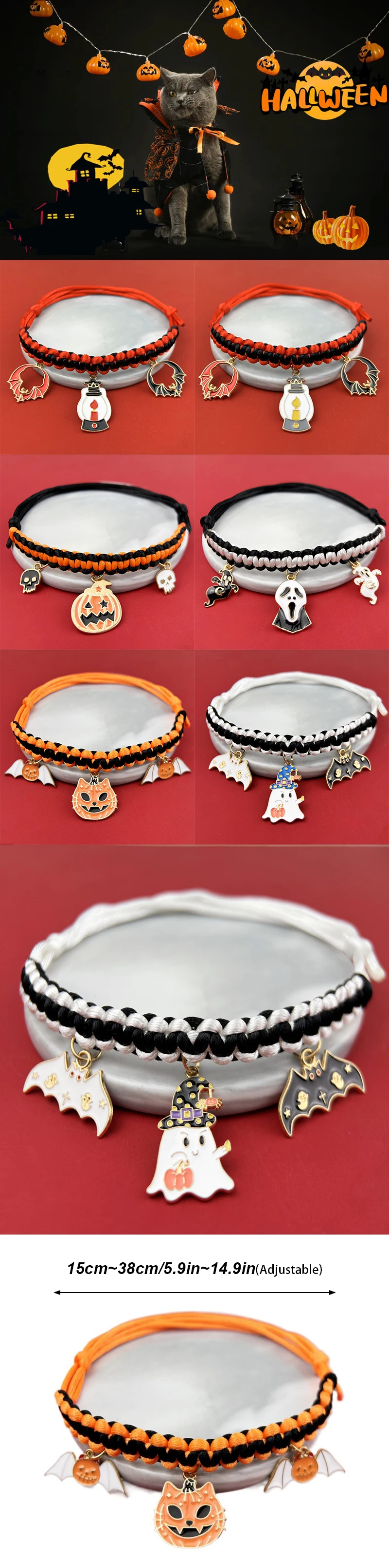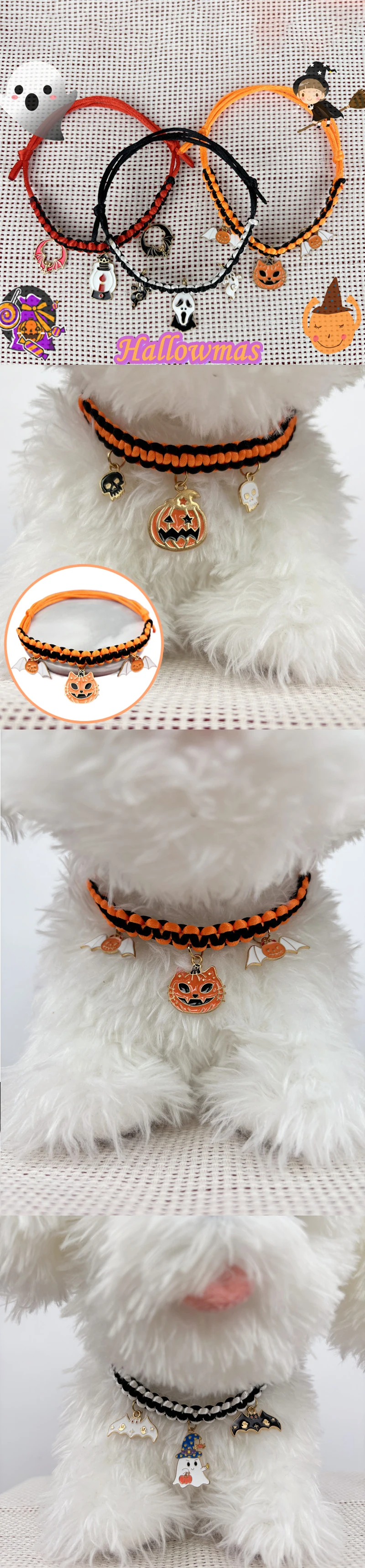 Dieses handgewebte Halloween-Halsband für Katzen, Kätzchen und kleine bis mittelgroße Hunde besticht durch liebevolle Details und einen klassischen Grusel-Look. Mit Anhängern in Form von Kürbissen, Geistern und weiteren Halloween-Motiven ist es das perfekte Accessoire für den Oktober.
