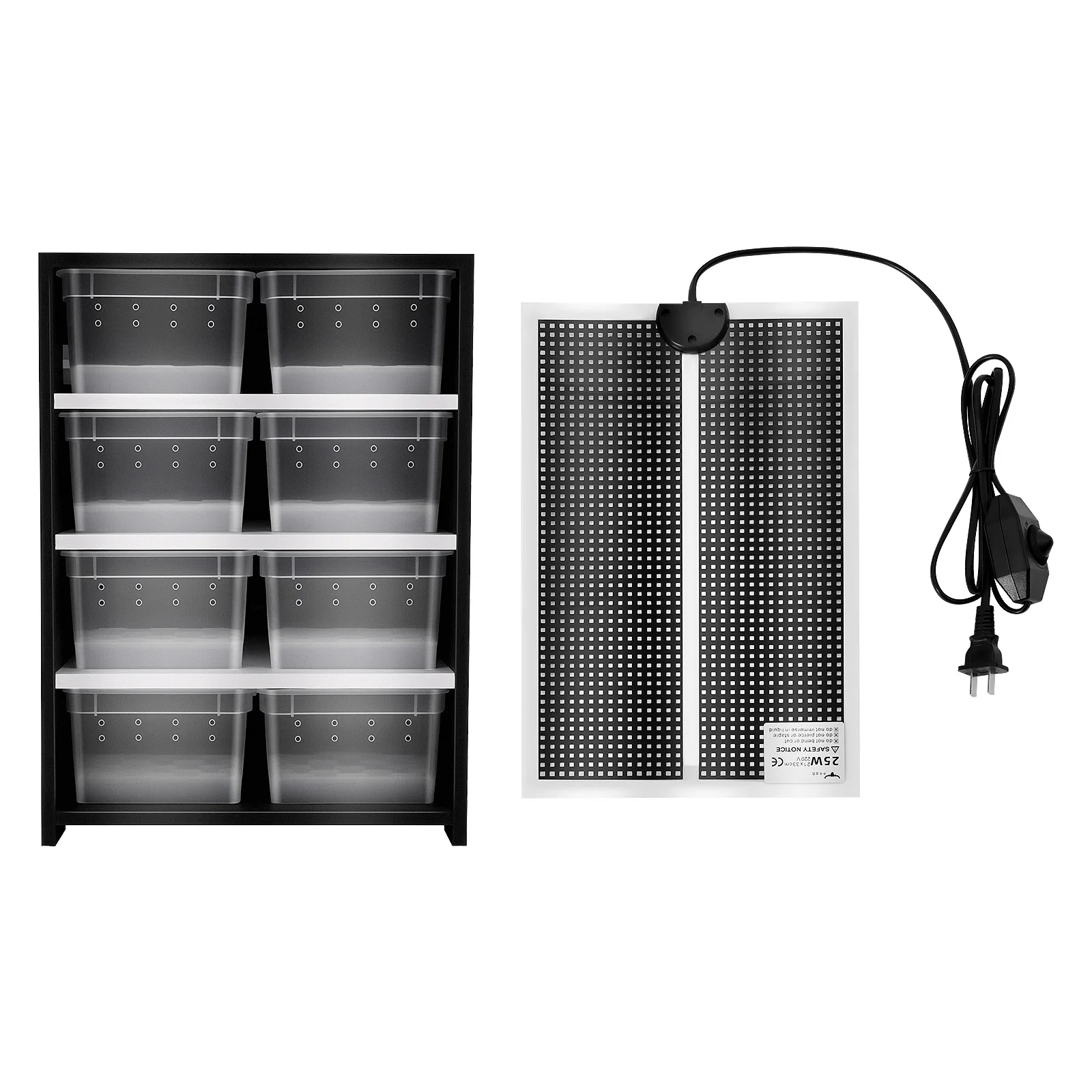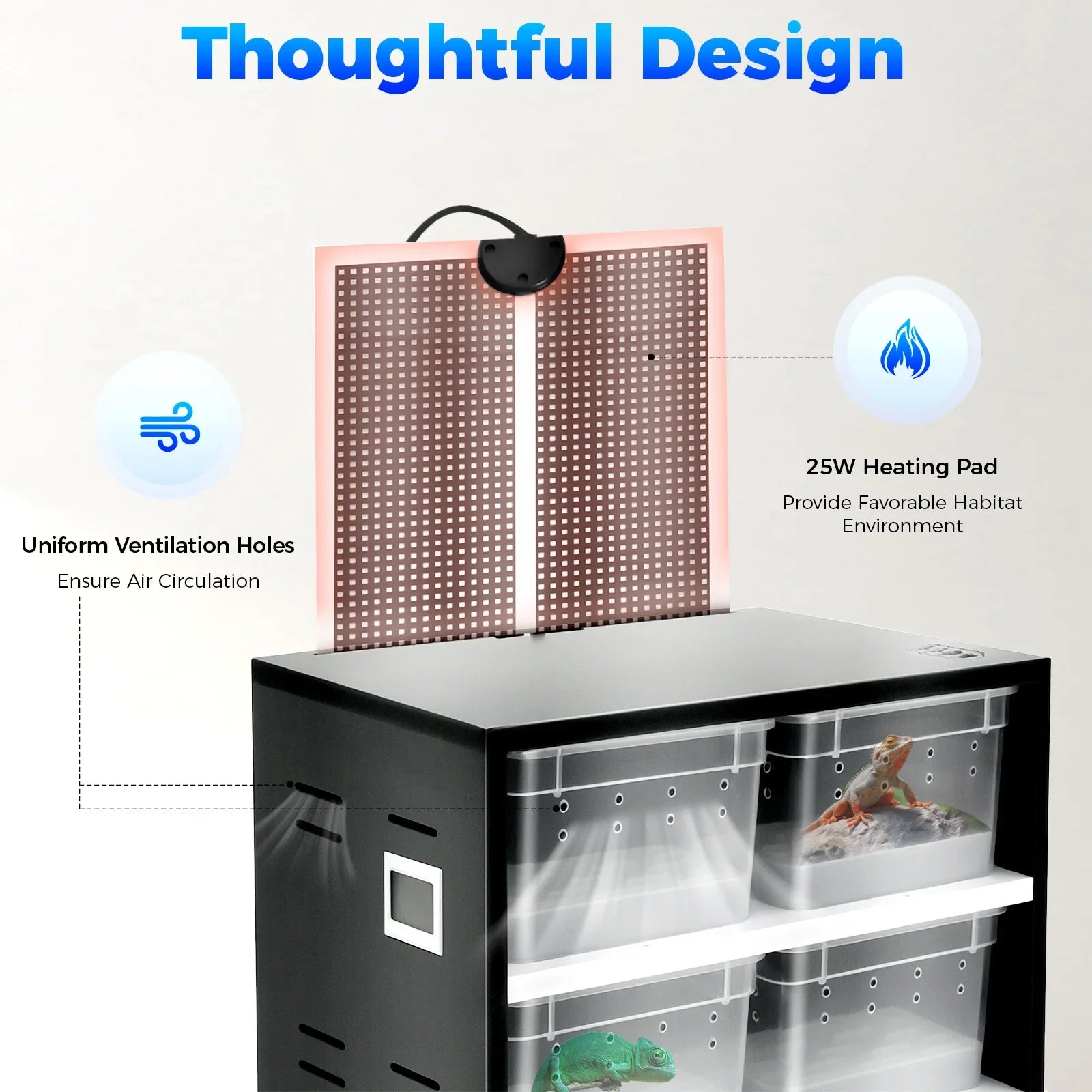 Thoughtful Design: The 25W heating pad with a thermostat can warm up your cabinet and provide a favorable habitat environment for your pet. The uniform ventilation holes on both sides of the cabinet and on the box effectively ensure air circulation and provide fresh air for reptiles.