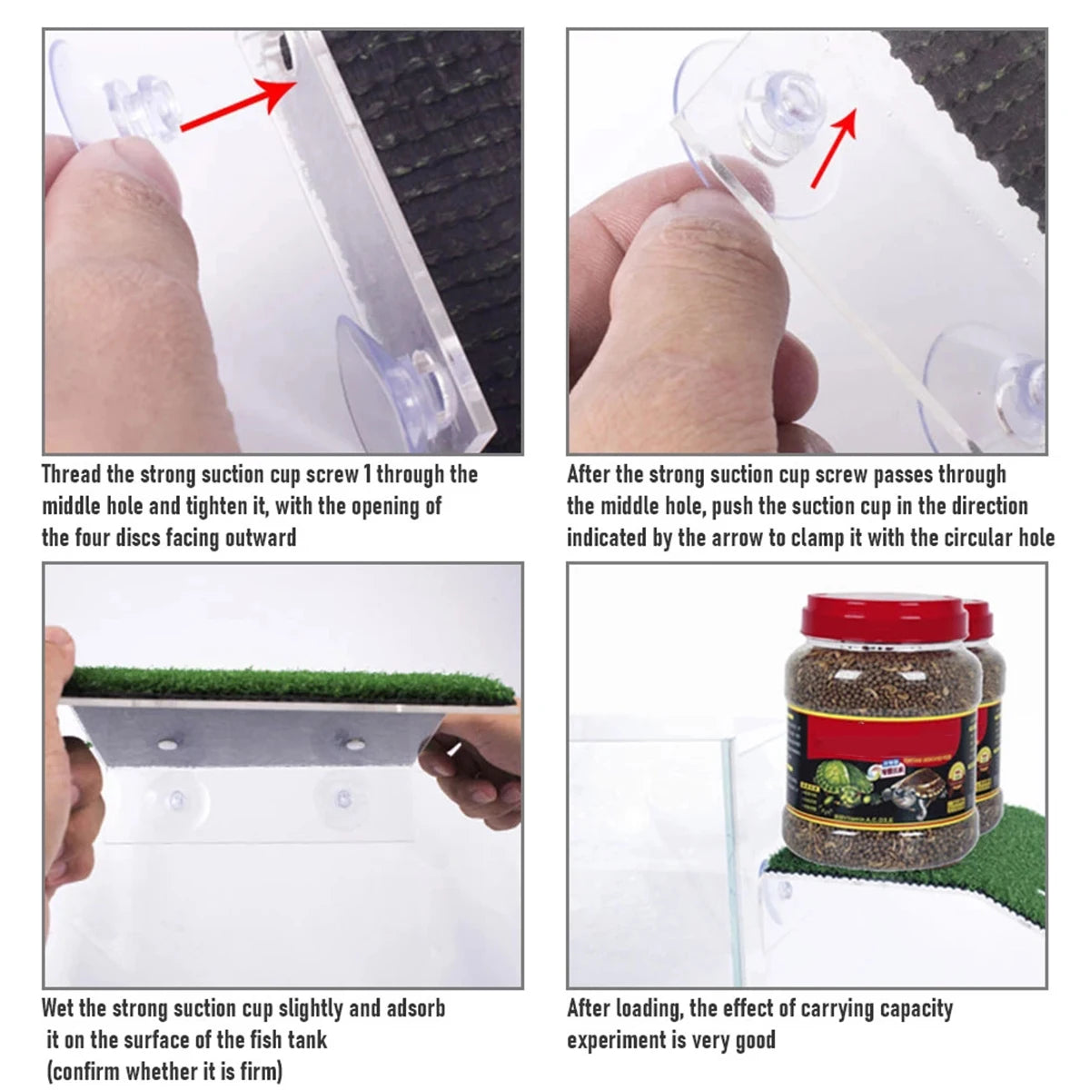 Die Oberfläche ist mit realistisch simuliertem Kunstrasen bedeckt, der weich, rutschfest und besonders attraktiv für Schildkröten ist. Dank der starken Saugnäpfe lässt sich die Plattform einfach an glatten Oberflächen wie Glas oder Acryl befestigen und bleibt sicher an Ort und Stelle.